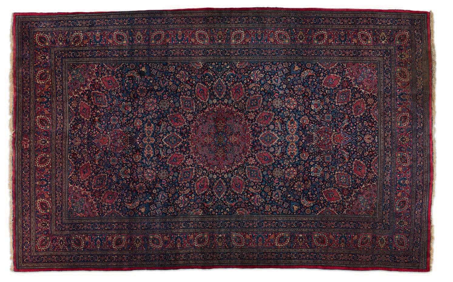 Velours de laine soyeuse de qualité sur fondations en coton. Champ bleu nuit à rinceaux et guirlandes de palmettes fleuries polychromes entourées de feuillages dentelés ornés d'une large rosace polylobée à couronne fleurie pâle et bleu ciel entourées de bulbes floraux en forme de gouttes d'eau. Quatre écoinçons rappelant le médaillon central. Multiples bordures dont la principale rubis à décor rappelant le champ central. Signé. Iran, vers 1920 / 1930.