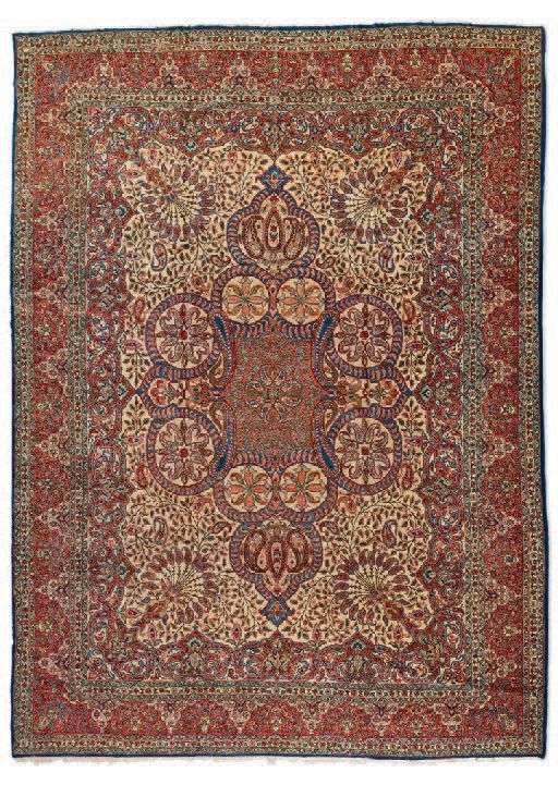 Velours de laine soyeuse d'agneau de grande qualité sur fondations en coton. Champ ivoire à décor de ramages de fines volutes de branchages crénelés de palmettes fleuries en torsades et incrustés de boutons floraux étoilés finement dessinés formant un très large médaillon central à fins botehs marine encadrant un pendentif rubis. Quatre écoinçons à palmettes en forme de plumes de paons faisant la roue. Large bordure rubis à semis de mirhabs de prière formés par des diamants stylisés. Iran, Époque du Shah, Vers 1960.