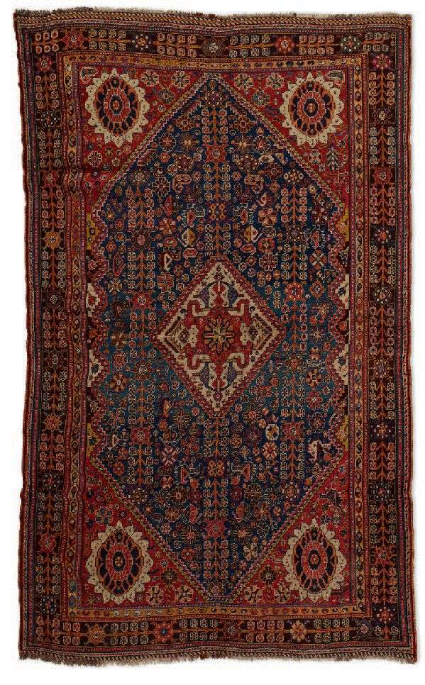 Velours de laine soyeuse sur fondations en laine. Champ bleu nuit à décor de multiples symboles stylisés représentatifs du sol. Il est orné d'un médaillon central couleur ivoire en forme de losange incrusté d'un crabe stylisé en polychromie. Quatre écoinçons en briques à bulbes de floraux stylisés. Large bordure bleu nuit à brins de fleurs en forme de diamants stylisés. Iran, fin du XIXe siècle.