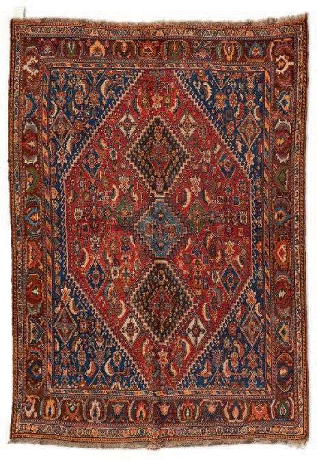 Velours de laine sur fondations en laine. Champ rouge brique à décor de semis de caissons floraux stylisés en forme de diamants entourés de boutons et feuillages dentelés polychromes orné de trois médaillons crénelés bleu nuit et gris bleuté. Quatre larges écoinçons bleu nuit à décor rappelant le champ central. Triple bordure. Iran, fin du XIXe siècle - début du XXe siècle.