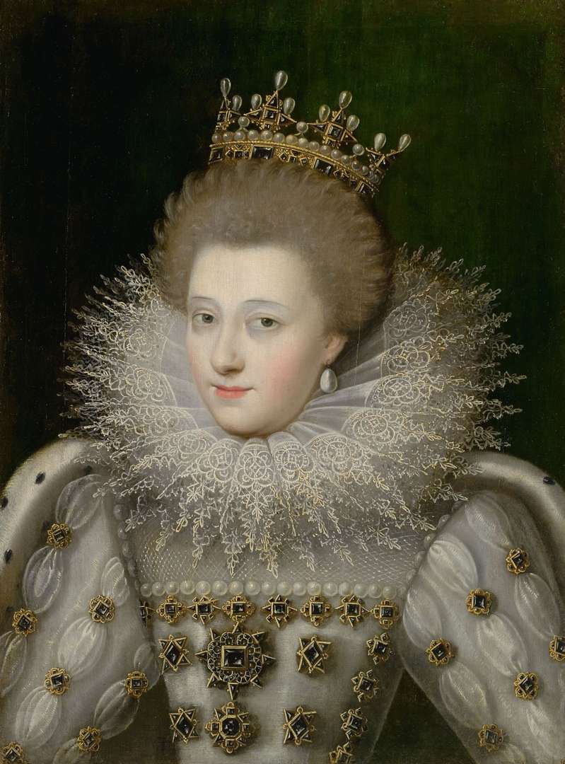 participe à ce rendu particulièrement subtil que l’on retrouve dans la chevelure, entre mèches bouclées et tirées vers l’arrière mais également dans le traitement remarquable de la collerette en dentelle. La stature est renforcée dans sa présence par l’épaisseur du manteau dont on devine la bordure d’hermine, et ouvert sur une très riche robe brodée de ijoux. L’or, les saphirs, les perles s’y répondent et s’accordent à la couronne faite des mêmes éléments.