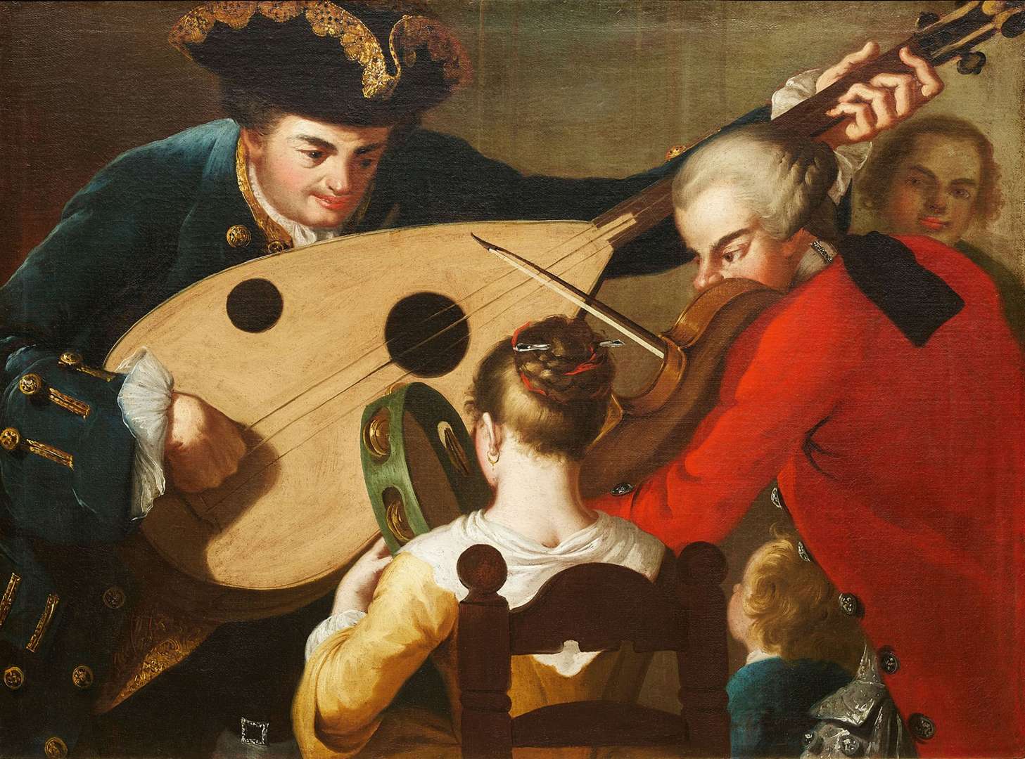 On y trouve sur la droite les éléments récurrents des compositions du peintre, à savoir un joueur de luth, une femme jouant du tambourin et des danseurs de tarentelle. Notre tableau ne fait pas exception à la règle : se déroulant dans un espace clos, le cadrage est resserré sur un joueur de luth, un violoniste et une joueuse de tambourin vue de dos. Les agréments de l’ouïe semblent se mêler à ceux de la vue, les regards des personnages masculins surplombant cette femme dont la nuque s’offre au spectateur. Aimant à se définir comme anglais, Fabris fut sans doute le plus italien des britanniques, toujours sensible à l’attrait d’une ville où le plaisir se joue en chanson et la joie se meut dans les pats légers