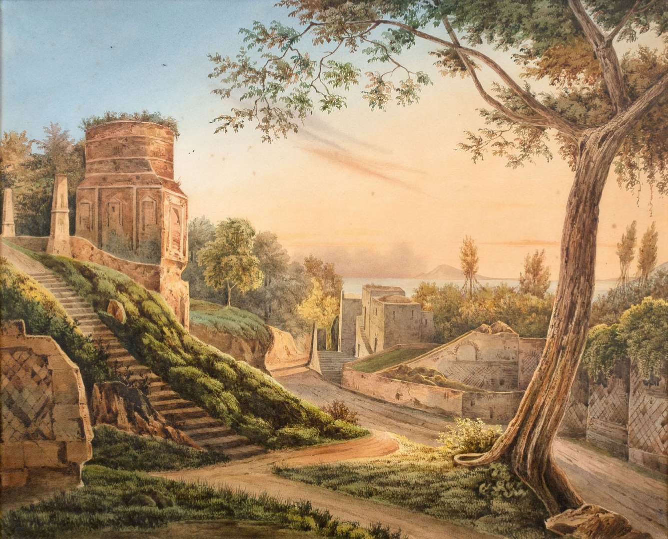 présentons s’inscrivent dans le goût des petites gouaches napolitaines. Ces dernières étaient très prisées aux XVIIIe et XIXe siècles, notamment par les touristes européens, désireux de rapporter des souvenirs et images de leurs voyages. Si la gouache est restée l’apanage de Naples, qui était alors une des villes les plus importantes d’Europe et une étape incontournable du Grand Tour d’Italie, ce voyage qu’effectuaient les jeunes instruits en complément de leurs études, elle s’est toutefois répandue dans le reste de l’Italie. Bien que généralement anonymes et de petit format pour faciliter le transport, le succès de ces oeuvres va durer plus d’un siècle et va conduire de nombreux artistes à se consacrer à ce type de production.