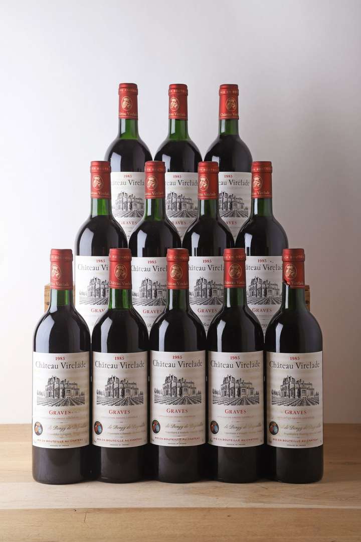 12 B CHÂTEAU VIRELADE Rouge (Caisse Bois d'origine) (H.E.+ ou mieux| e.f.s. légères dont 1 e.a| 3 c.a. bas de jupe) - 1985 - Graves