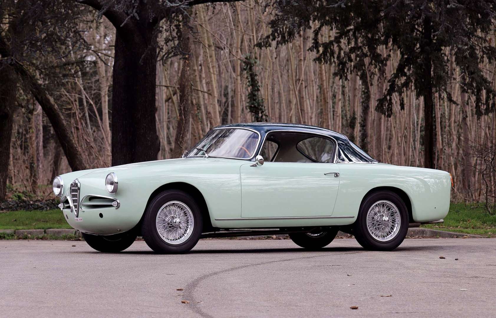 Notre exemplaire a été livré neuf en Suisse avant d’arriver en France dans les années 1970, aux mains d’un certain M. Durieux. On retrouve la voiture en 2003 en Belgique où elle va bénéficier d’une restauration importante avec mise à nu intégrale de la carrosserie, avant de recevoir une peinture deux tons Azzuro Verde Oceano avec toit vert foncé et intérieur assorti. La voiture est également équipée d’un levier de vitesses Nardi au plancher et de superbes roues fil Borrani. Cette rare Alfa Romeo est esthétiquement dans un état proche de la perfection et est prête à participer à n’importe quelle manifestation historique à commencer par le Tour Auto ou les très courues 1000 Miglia.