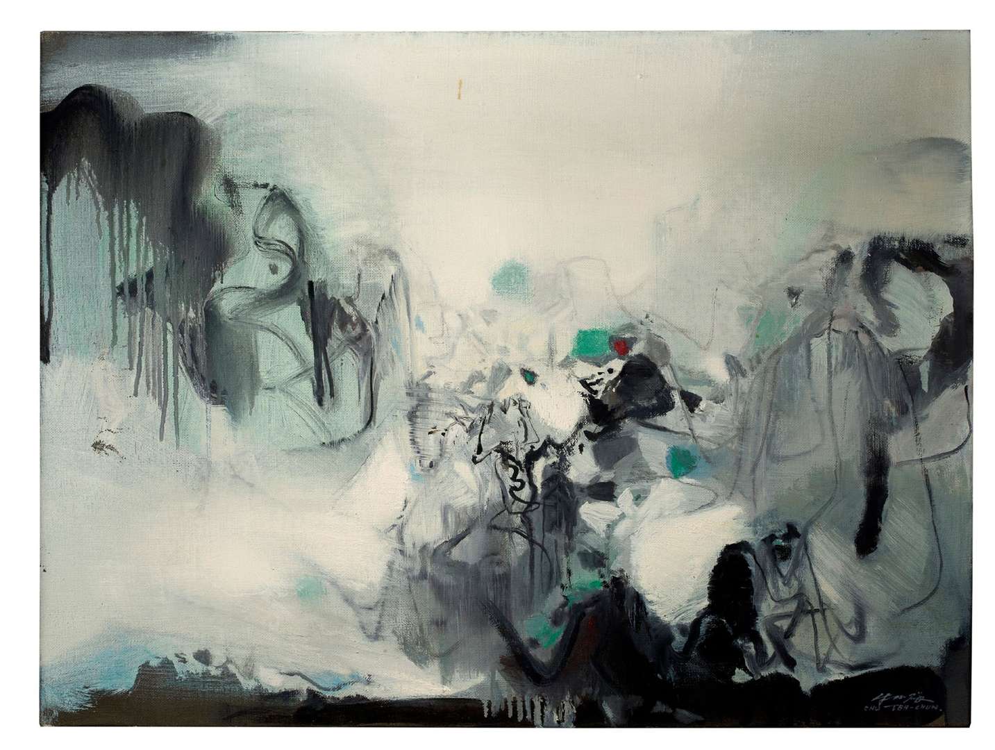 Cette oeuvre inédite datant de 1979, n’est pas sans rappeler sa fameuse série des neiges. Paysagiste de l’abstrait, Chu Teh-Chun tombe amoureux des montages françaises dès le milieu des années 1960 et s’attèle dès lors à en dépeindre toute la complexe beauté. Cette toile dont le blanc représente une majeure partie de sa surface, évoque un paysage montagneux hivernal, tout en falaises et en reliefs, et dont les teintes bleutés évoquent des reflets glacés de la neige. La paisible élégance de cette toile amène son spectateur à une certaine forme de sérénité, à mesure que son regard se perd au-delà des cimes abstraites des montagnes froides et hostiles.