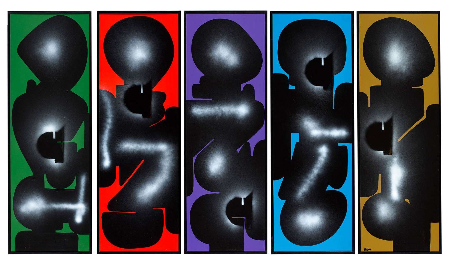 Cette oeuvre, monumentale, est composée de 5 panneaux répétant les mêmes motifs en différentes déclinaisons de couleurs, et est très certainement la plus grande oeuvre connue de cet artiste.