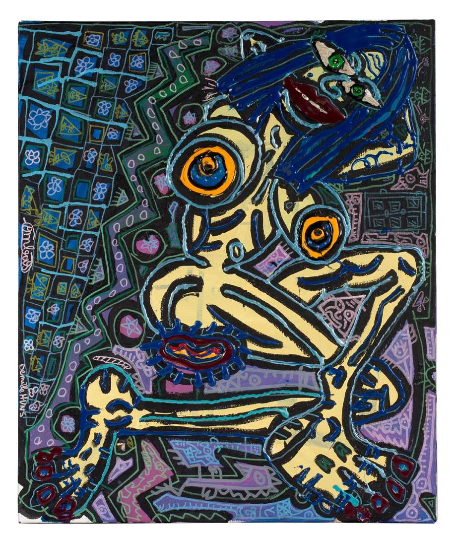 Technique mixte sur toile, signée à gauche, contresignée, datée, titrée et dédicacée au dos. La dédicace est accompagnée d'un dessin au dos de la toile.