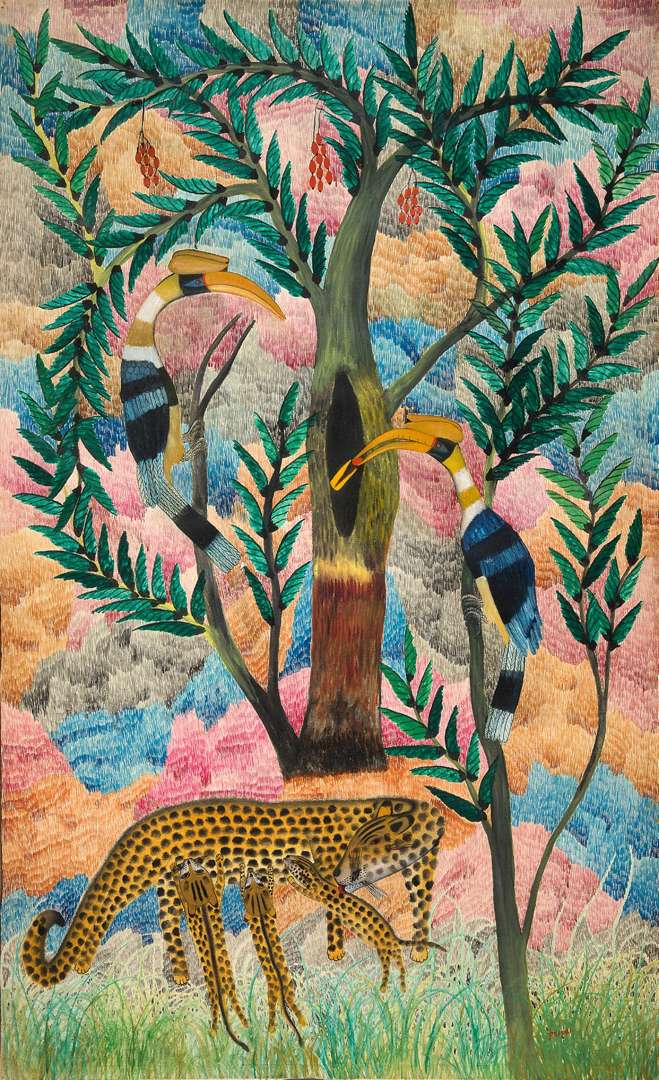 Léopard, trois jeunes, et couple calao