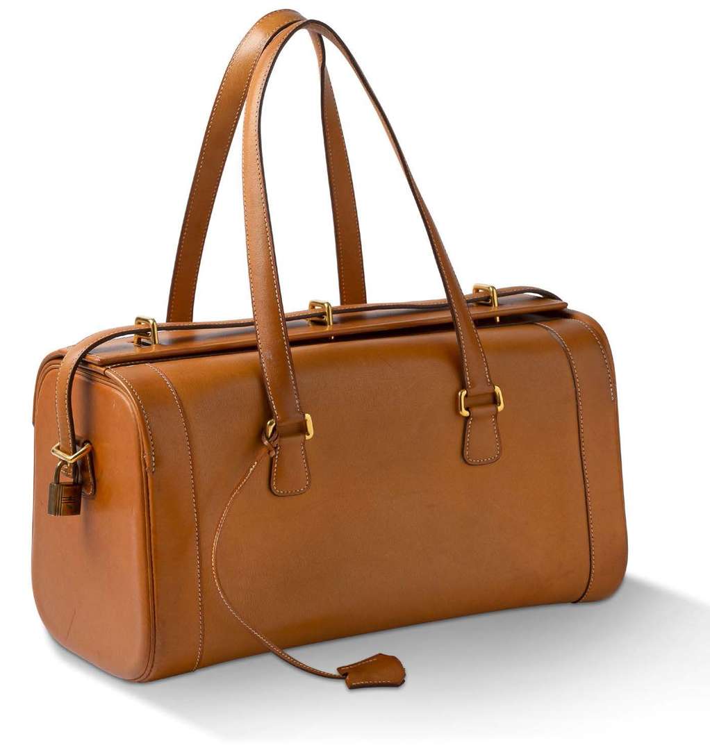 Sac en cuir camel, double poignées en cuir et garniture en métal doré