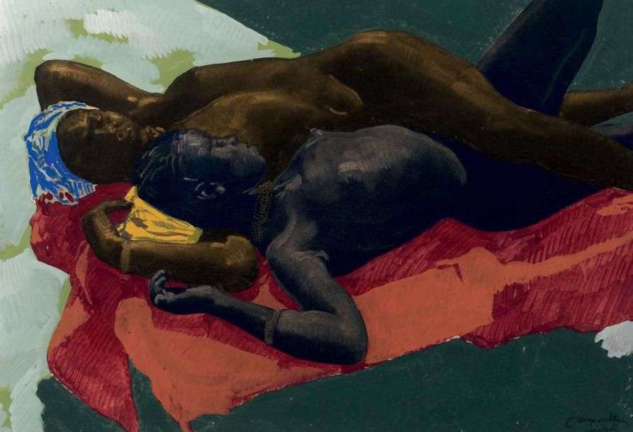 Repos sous la lune Gouache avec rehauts d'or et d'argent, signée et située en bas à droite 49 x 70 cm à vue - 191/4 x 271/2 in. Gouache with gold and silver highlights, signed and situated lower right Provenance: Collection privée, France Né à Nancy en 1886, Jacques Majorelle est le fils du célèbre ébéniste Louis Majorelle, ce qui lui permet de baigner dès son plus jeune âge dans un milieu artistique et culturel épris de nature. Il s'éloigne vite de Nancy et d'une première formation d'architecte décorateur pour laisser libre cours à sa passion pour la peinture et monte à Paris. Il part à la découverte de l'Espagne et de l'Italie afin de compléter sa formation mais c'est en 1910, qu'il découvre l'Egypte, sa lumière, ses couleurs, ses coutumes. Démobilisé, il arrive au Maroc en 1917, et découvre Marrakech. Il s'y installe définitivement dès 1919. Si, dans un premier temps, il réalise avant tout des scènes de la vie quotidienne, souks, kasbahs, petits métiers de la rue, il effectue dès 1921, plusieurs expéditions dans l'Atlas, devenant par là même l'un des premiers découvreurs du Sud marocain. Ces voyages lui permettent de réaliser des oeuvres picturales majeures mais également une publication toujours recherchée par de nombreux collectionneurs. Dans les années 30, il s'intéresse davantage à la représentation de «négresses nues» mais il faudra attendre la fin de la seconde Guerre Mondiale pour que Majorelle parte à la découverte de l'Afrique Noire. Explorateur infatigable de nouvelles contrées, Jacques Majorelle n'a jamais cessé d'employer des techniques variées afin de pouvoir restituer la beauté et la luxuriance des lumières et des paysages rencontrés. On sait qu'il réalisa de nombreuses photos des pays parcourus, en plus des études dessinées sur place, cela lui permettant de peindre ensuite de nombreuses compositions. Les tableaux que nous présentons à la vente sont le reflet de ses voyages et de ses expériences picturales. Ainsi, nous proposons six huiles sur carto