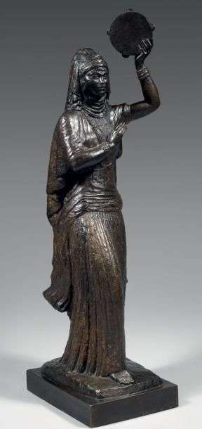 Danseuse algérienne au tambourin Bronze à patine mordorée, signé sur le côté de la terrasse Haut: 82 cm - 32 in. Bronze with patina, signed on the side Le bronze que nous présentons est l'une des deux versions du modèle réalisé par l'artiste. L'autre version, sans le tambourin, est visible au musée des années 30.