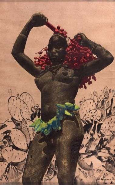 La récolte de dattes, Marrakech, circa 1931-1935 Technique mixte avec rehauts d'or, signée et située en bas à droite 69 x 44 cm (à vue) - 27 x 171/4 in. Mixed media with gold highlights, signed and situated lower right Provenance: Collection privée, France
