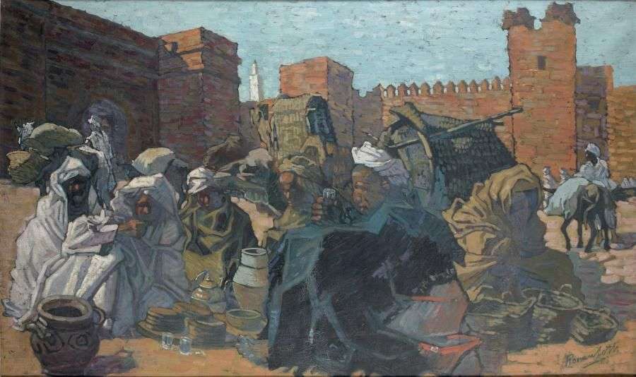 Marché de la laine à Rabat Huile sur toile, signée en bas à droite 110 x 180 cm - 431/3 x 71 in. Oil on canvas, signed lower right