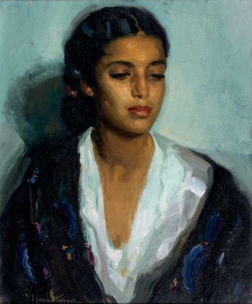 Portrait de jeune femme, 1938 Huile sur toile, signée, située Séville et datée en bas à gauche 55 x 46 cm - 213/4 x 18 in. Oil on canvas, signed, situated Seville and dated lower left Provenance: Collection privée, Europe