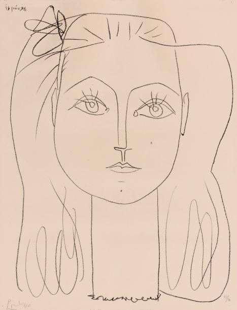 Françoise au noeud dans les cheveux, 14 Juin 1946 (Mourlot 41| Bloch 397) 63 x 47cm - 243/4 x 181/2 in. Lithographie Epreuve sur velin d'Arches signée, numérotée 47/ 50. Légèrement jaunie. Petites rousseurs, quelques trous d'épingle dans les angles. Maintenue par des points de colle dans le bord supérieur. Cadre Feuillet (Size sheet): 66 x 50 cm - 26 x 193/4 in. Proof on Arches wove paper, signed and numbered 47/ 50. Lightly yellowed, some light stains, and few pinehole in corners. Some glued part on the upper edge. Framed Provenance: Collection privée, France Expert: Madame Sylvie Collignon - 01 42 96 12 17