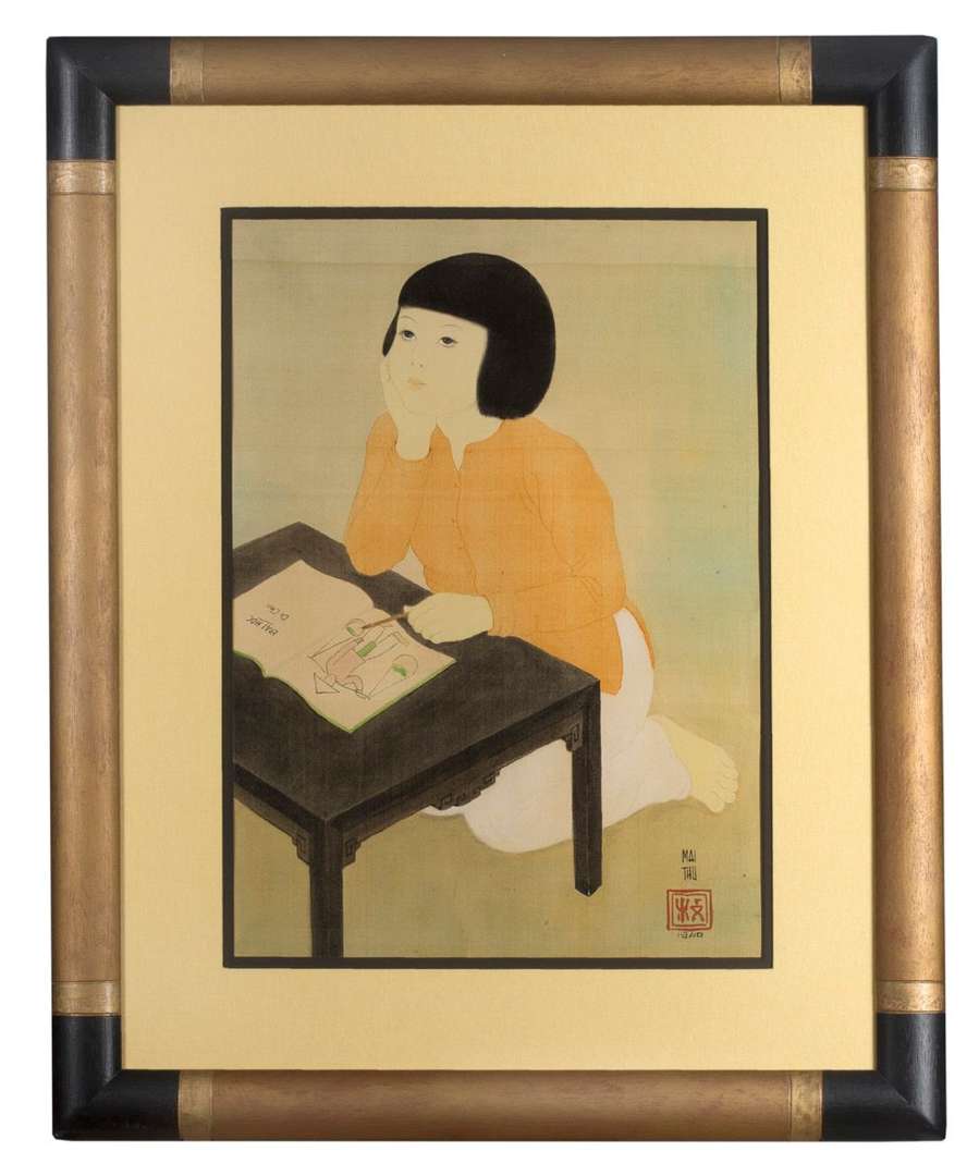 ont un modèle portant une tenue jaune et blanche avec un visage similaire. La fillette est ici accoudée, perdue dans ses pensées. Le cahier ouvert posé sur la table laisse apparaitre un dessin d’un homme portant des palanches ainsi que l’inscription Bài học signifiant « leçon ». L’éducation lettrée dont a profité Mai Trung Thứ lui permet de restituer fidèlement l’enseignement transmis aux enfants de son pays. L’arrière-plan neutre permet une simplification de la composition caractéristique de cette période. Durant ces années, l’artiste date encore ses oeuvres avec des chiffres romains. Le travail de l’artiste est ici d’une très grande qualité d’exécution, son trait est précis et assuré. Le charme et l’exotisme des oeuvres de Mai