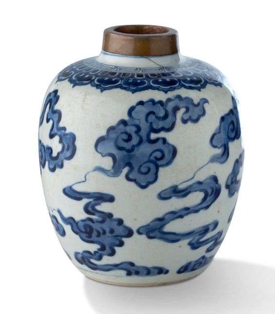 Petite jarre ovoïde en porcelaine bleu-blanc à décor de nuées stylisées, l'épaule ornée de frises de pétales de lotus et ruyi. La lèvre avec une monture en alliage cuivreux. La base avec une marque représentant un champignon lingzhi en bleu sous couverte.