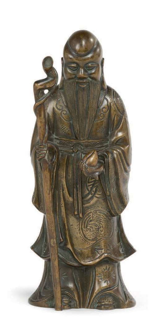 Statue de Shoulao en bronze à patine brune, l'immortel taoïste représenté debout vêtu d'une longue robe flottante ornée de médaillons de grue, tenant un haut bâton et une pêche de longévité.