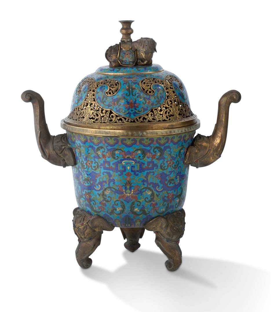 Important brûle-parfum tripode couvert, en alliage de cuivre doré et émaux cloisonnés polychromes sur fond bleu, la panse bombée, à décor de papillons dans les lotus, rinceaux et qilongs, les prises évasées et les pieds galbés en forme de têtes d'éléphant harnachées agrémentées de cabochons, un éléphant couché avec un vase sur le dos surmontant le couvercle à ressauts, ce dernier orné d'une alternance de ruyis et de réserves ajourées de rinceaux et de fleurs.h. 42,5 cm (couvercle voilé à la base, petites lacunes d'émail, cabochons manquants, usures à la dorure et traces d'oxydation)provenancecollection particulière, france (par descendance)