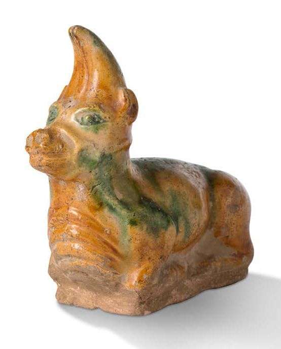 Petite figurine en terre cuite moulée glaçurée orange et vert représentant une bête cornue couchée portant un harnais.