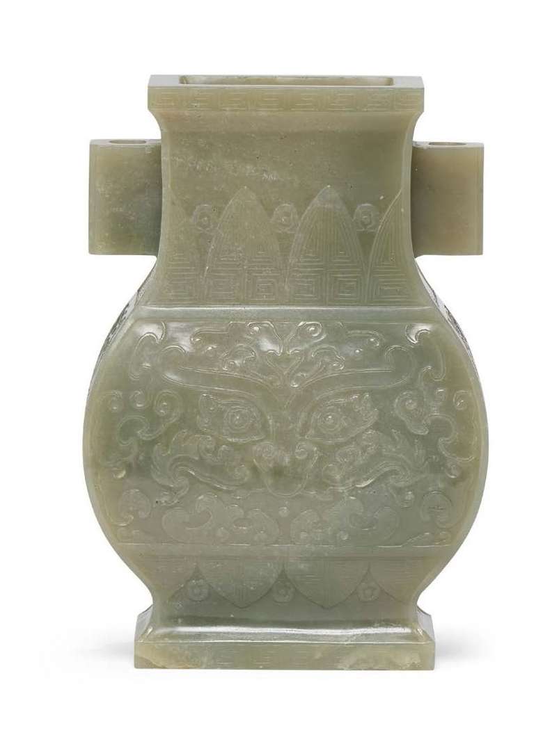 Vase Fang Hu en jade sculpté à décor de style archaïsant, le col flanqué de deux larges anses de section carrée, la panse ornée d'un décor en léger relief de masques de taotie encadré par des motifs de feuilles de bananier stylisées.