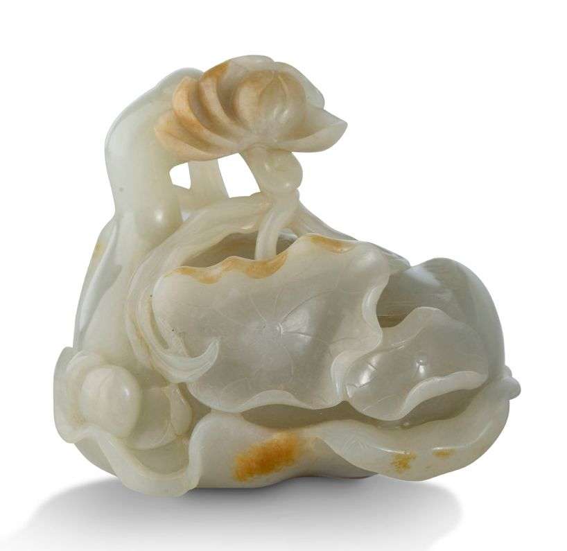 Groupe sculpté en jade céladon pâle représentant une oie couchée sur une large feuille de lotus, tenant dans son bec un bouquet de feuilles de lotus et fleur de lotus épanouie. Le jade d'une belle teinte céladon pâle avec quelques inclusions de rouille, la pierre avec un beau poli et un élégant travail de ciselure du plumage de l'oiseau.