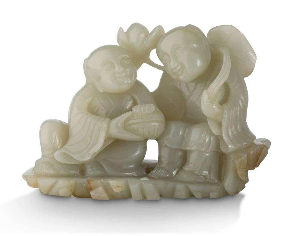 Groupe en jade céladon sculpté représentant deux enfants souriants, vêtus de robes aux manches flottantes, assis sur un rocher, l'un tenant une tige de lotus s'épanouissant sur son épaule, tandis que l'autre présente une petite boîte en vannerie. La pierre finement ciselée, avec un beau poli.