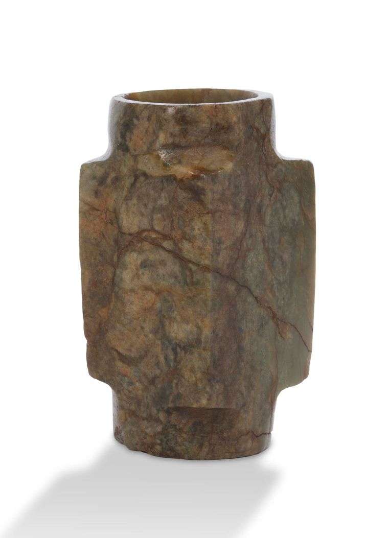 Cong en jade céladon sombre marbré de veines rouille, la pierre avec un beau poli.