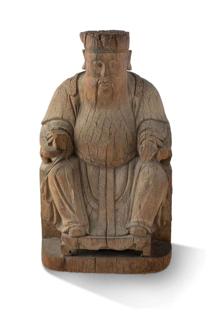 Imposante statue en bois sculptée représentant un dignitaire trônant, les pieds reposant sur un marche-pied, vêtu d'une longue robe traditionnelle, coiffé d'un bonnet de lettré aux rubans retombant dans le dos et tenant une coupe dans la main gauche.