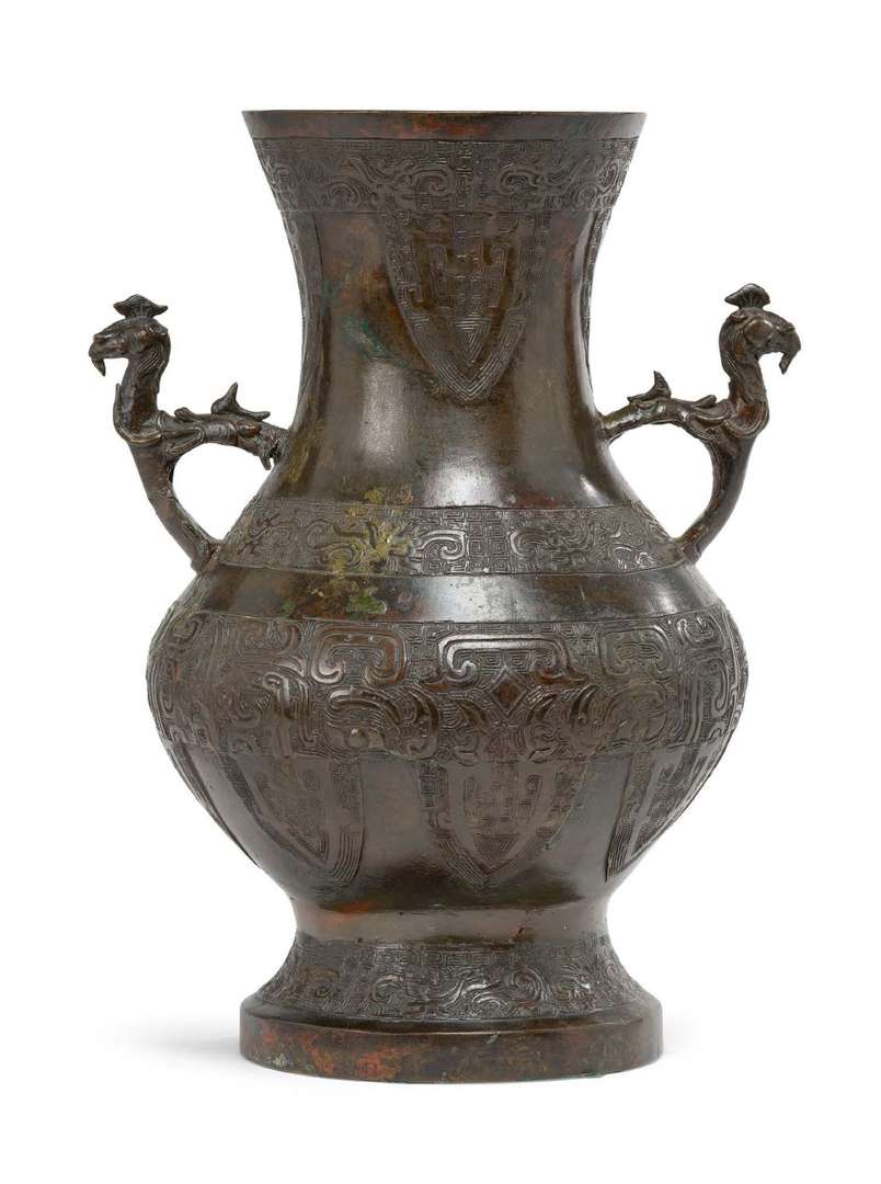 Important vase Zun en bronze à patine brune à décor archaïsant, l'épaule basse s'élançant en un large et haut col décoré de dragons, leiwen et cigales stylisées, flanqué de deux anses représentant des créatures mythiques.