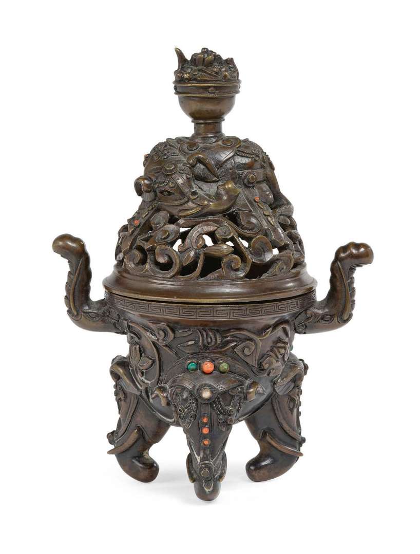 Petit brûle-parfum couvert en bronze à patine brune et incrustations de pierres dures, reposant sur trois pieds en forme de tête d'éléphant harnaché, la panse ornée de rinceaux de lotus et flanquée de deux anses en forme de trompe d'éléphant.