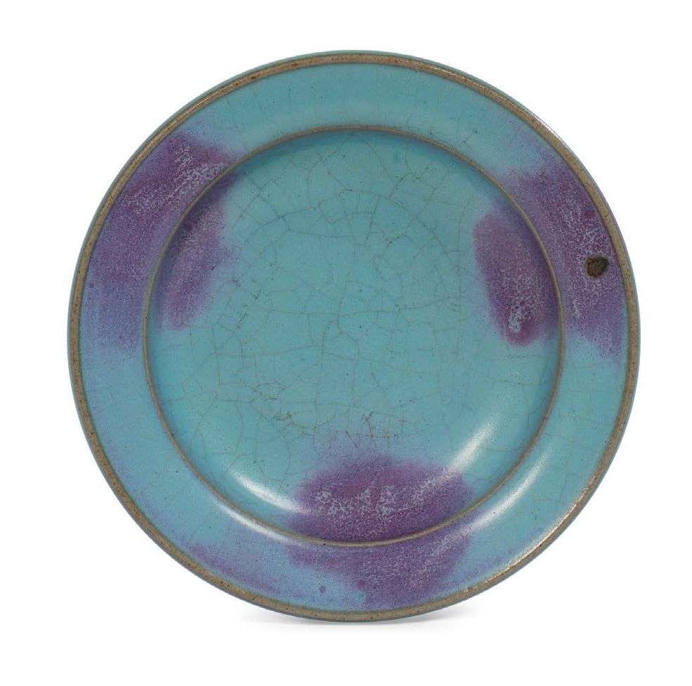 Petit plat en grès à couverte Jun, de forme ronde à l'aile étroite, reposant un court pied circulaire. La couverte d'une délicate teinte bleutée ponctuée de taches pourprées, veinée d'un réseau de fines craquelures.