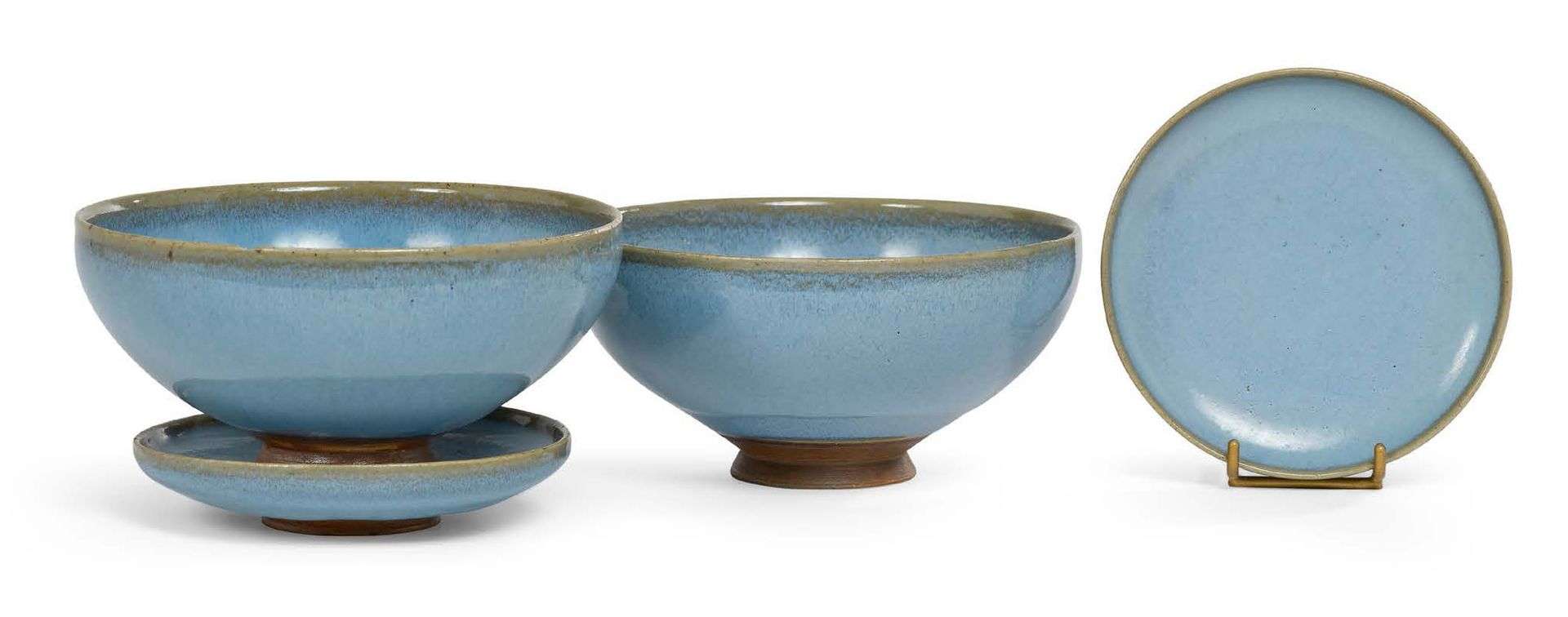 Ensemble de deux bols et deux petits plats en grès à couverte bleutée, à l'imitation des Jun Yao.