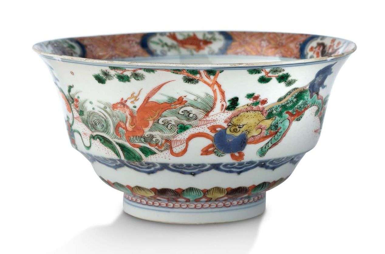 Bol de type klapmut en porcelaine et émaux wucai décoré d'animaux mythiques. L'intérieur avec un médaillon circulaire montrant une carpe jaillissant des flots, le bord peint d'une frise alternée de motifs de sapèques et réserves peuplées d'animaux aquatiques.