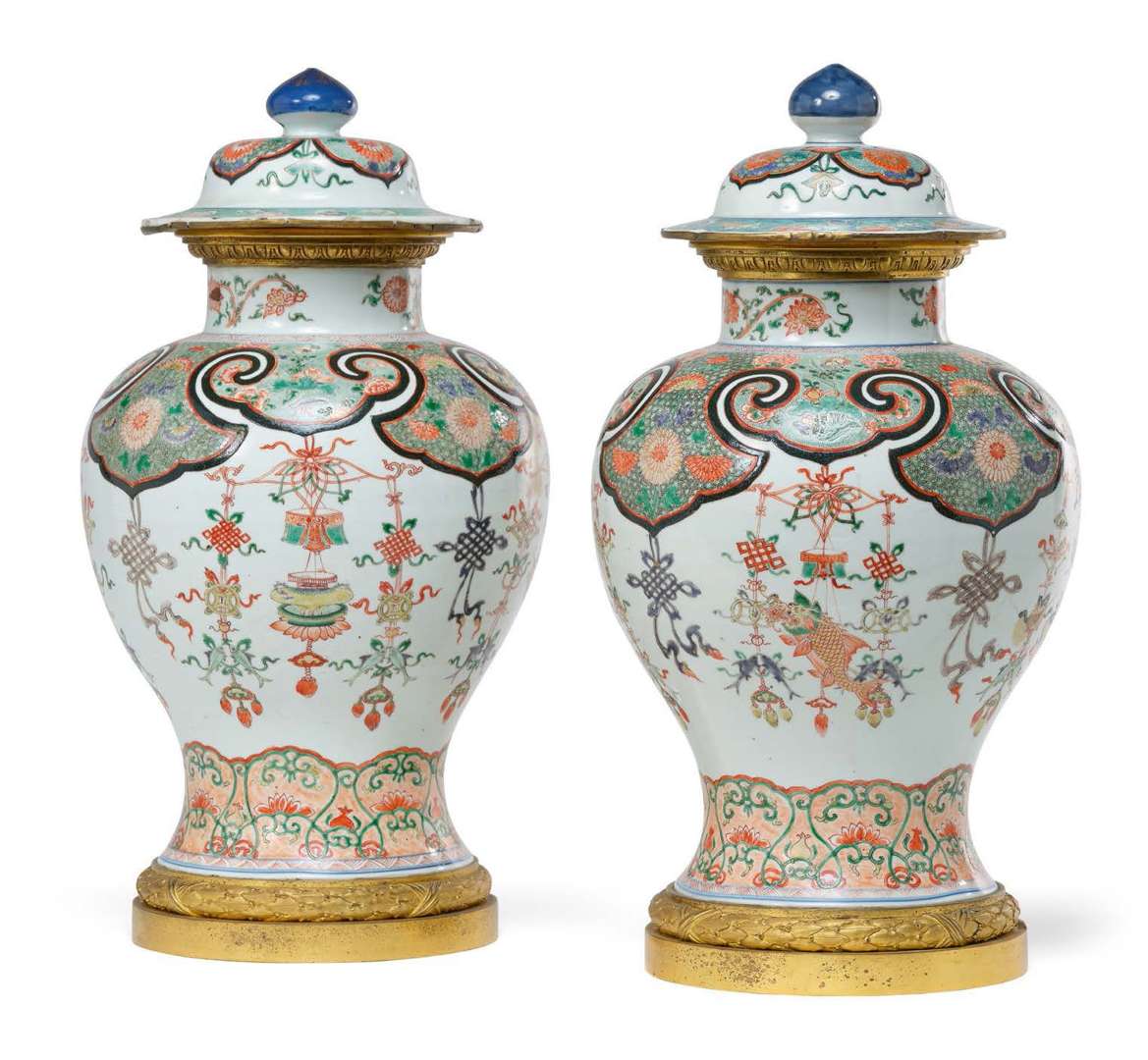 Paire de potiches couverte en porcelaine aux émaux de la famille verte et à l'or, l'épaule ornée d'une importante réserve continue en forme de ruyi cernée d'émail noir et décorée de fleurs et papillons sur un fond vert. La panse ornée d'un complexe ensemble de guirlandes à pendeloques formées de motifs auspicieux et noeuds infinis. La partie inférieure avec une réseau d'entrelacs floraux. La base avec un double cercle en bleu sous couverte. Avec des montures en bronze doré au pied, au col et à l'intérieur du couvercle.