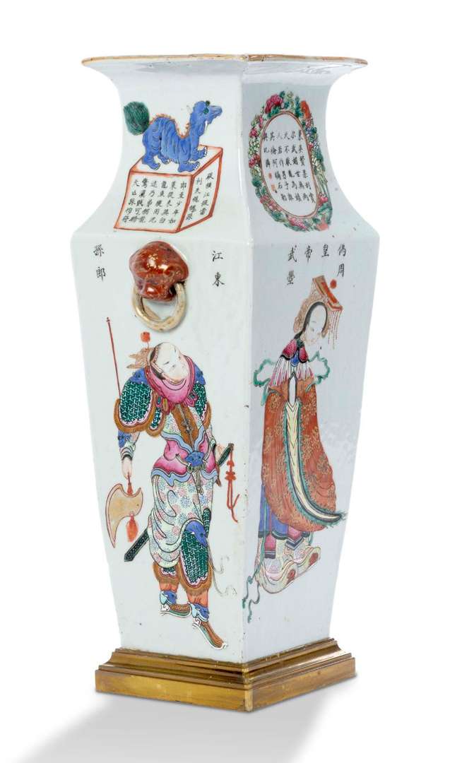 Paire de vases quadrangulaires en porcelaine aux émaux de la famille rose décorés de héros du Wu Shuang Pu, représentant les figures de Wu Zetian, impératrice de Chine au tournant du VIIIe siècle, Sun Ce, général de la période des Trois Royaumes, Qian Liu, souverain du royaume de Wuyue et enfin Liang