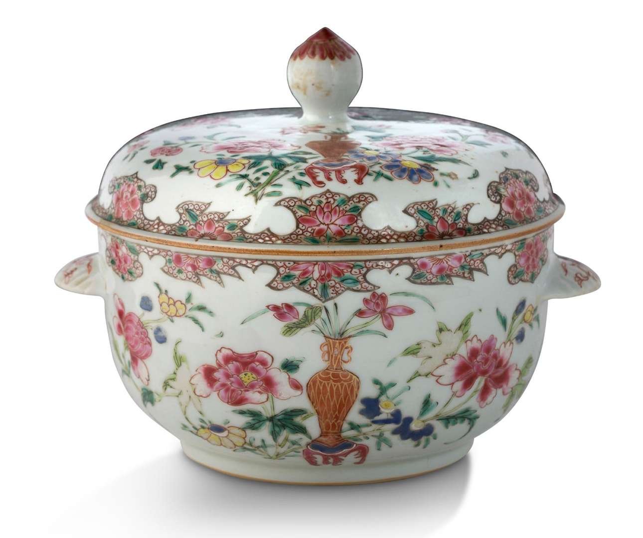 Soupière couverte ronde à oreilles en porcelaine aux émaux de la famille rose décorée de compositions mêlant fleurs épanouies et «Cent Antiques». Avec une note manuscrite «Soupière Chine Famille rose achetée chez Boskovitch 12.500 F 1961».