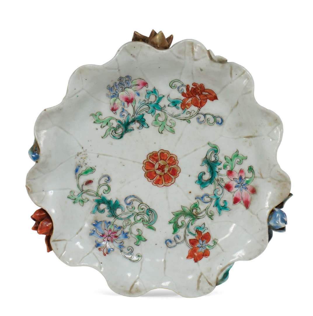 Petite coupe en porcelaine aux émaux de la famille rose à l'imitation d'une feuille de lotus, reposant sur trois petits pieds en forme de tiges de lotus se terminant en fleurs épanouies affleurant sur le bord de la feuille. L'intérieur de la coupe orné de fleurs et rinceaux en émaux sur couverte.