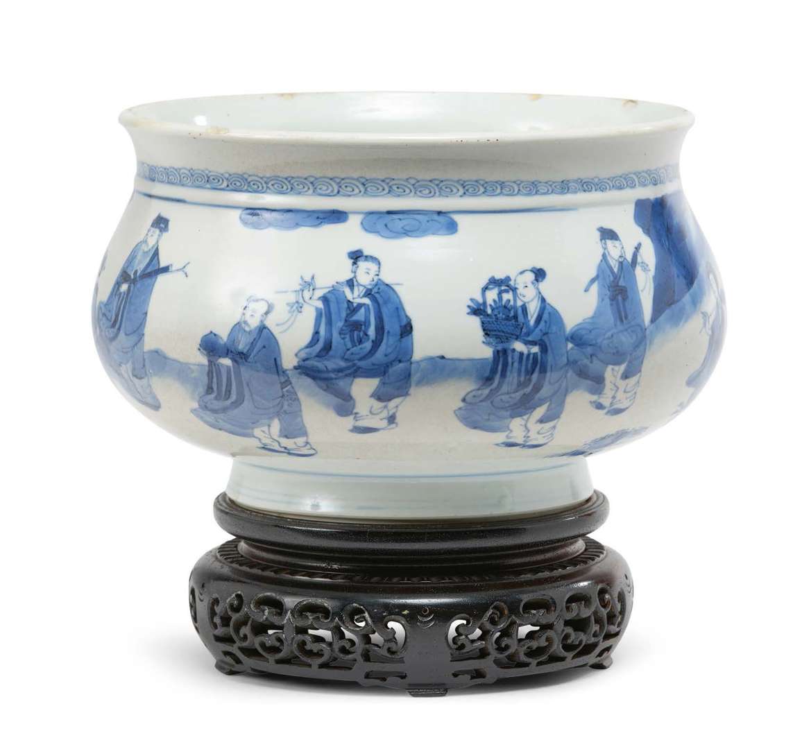 Brûle-parfum en porcelaine bleu-blanc, la panse globulaire aplatie s'évasant en un court col, décorée des Huit Immortels taoïstes et de Shoulao dans un paysage rocheux. La base avec une marque en quatre caractères Chenghua Nian Zhi. Avec son socle en bois.