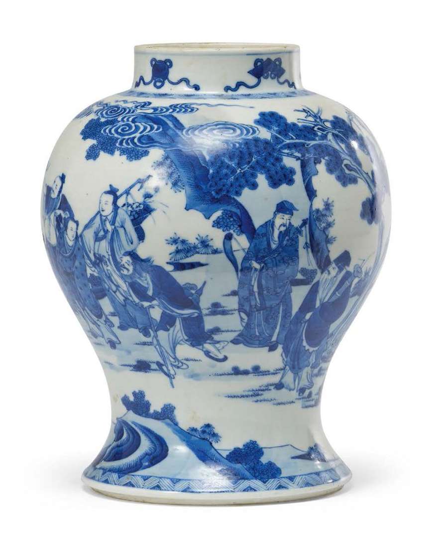 Vase balustre en porcelaine bleu-blanc décoré des Huit Immortels taoïstes dans un paysage rocheux, le col orné de motifs des Huit
