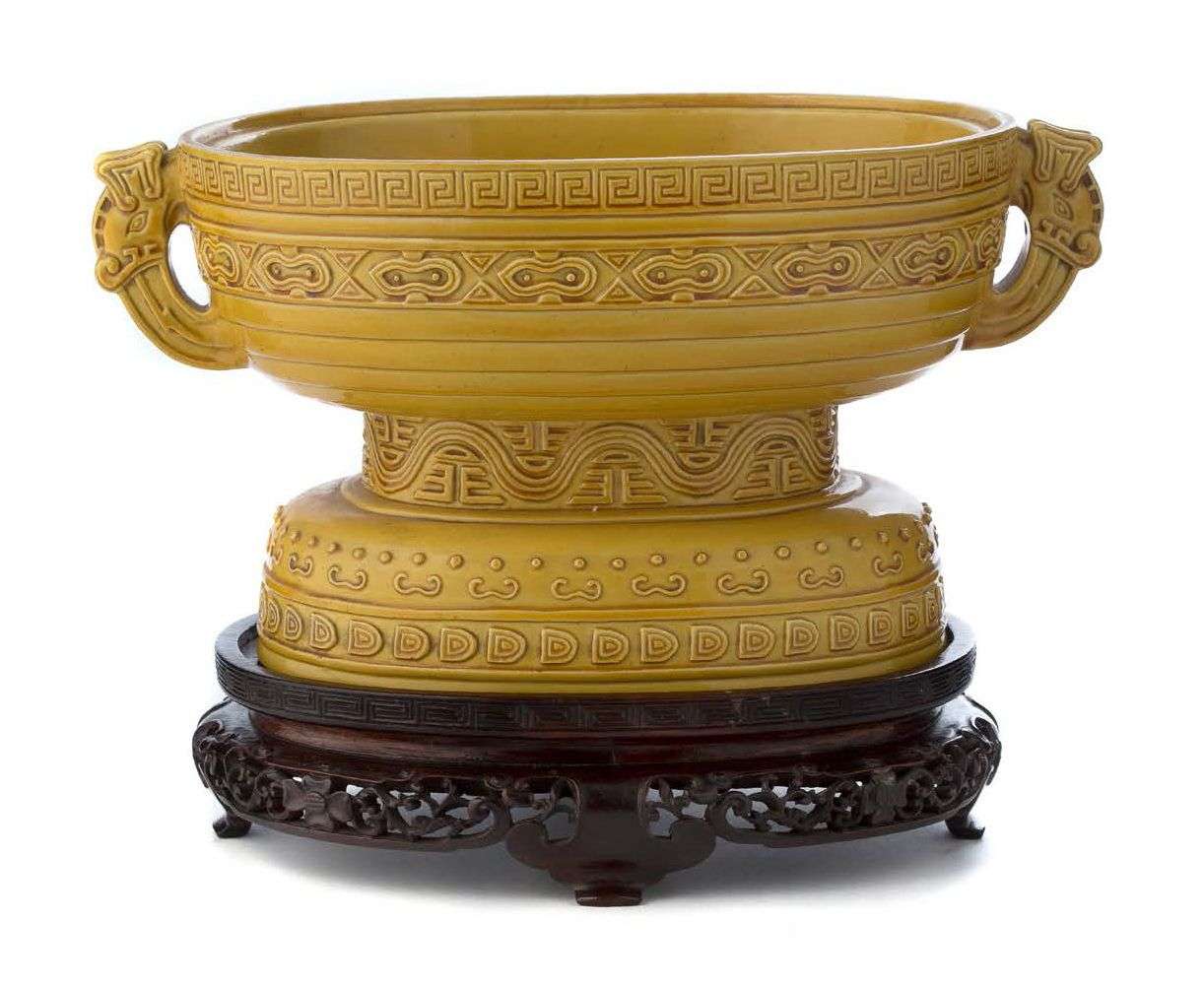 Rare paire de vases sacrificiels Gui en porcelaine monorochrome jaune, imitant les bronzes archaïques de même typologie de la dynastie des Zhou orientaux (770-256 av. J.C.), la panse de forme oblongue, flanquée de deux anses à têtes de dragon, et reposant sur un pied en forme de dôme. L'ensemble décoré de motifs géométriques archaïsants en relief, sous une belle couleur jaune moutarde. La base avec une marque Qianlong en à six caractères en zhuanshu incisés. Présentés sur des socles en bois naturel sculpté.