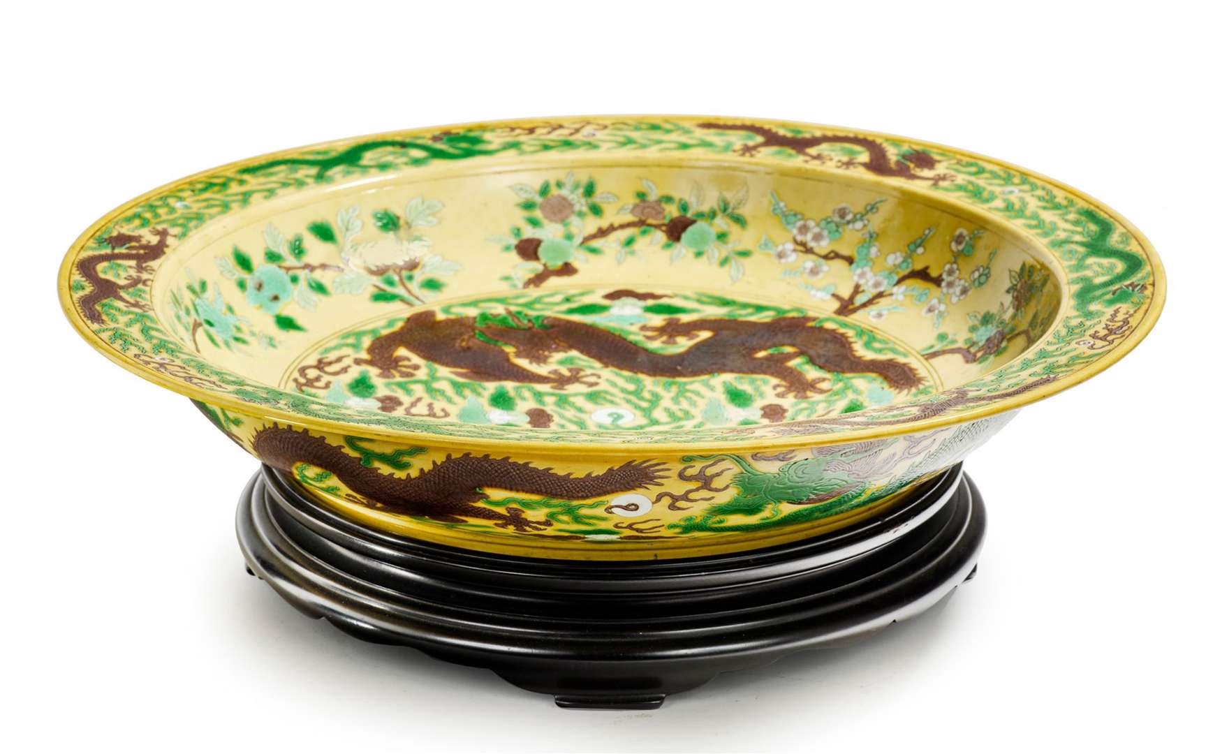 Grand plat en porcelaine émaillée sancai, à décor de deux dragons affrontés poursuivant le joyau sacré en médaillon central. La bordure centrale ornée de pivoines, chrysanthèmes, lotus, l'aile ornée de six dragons. Reprise du décor principal au revers, l'aile ornée de cinq phénix. Marque «Chu Xiu Gong» au revers.