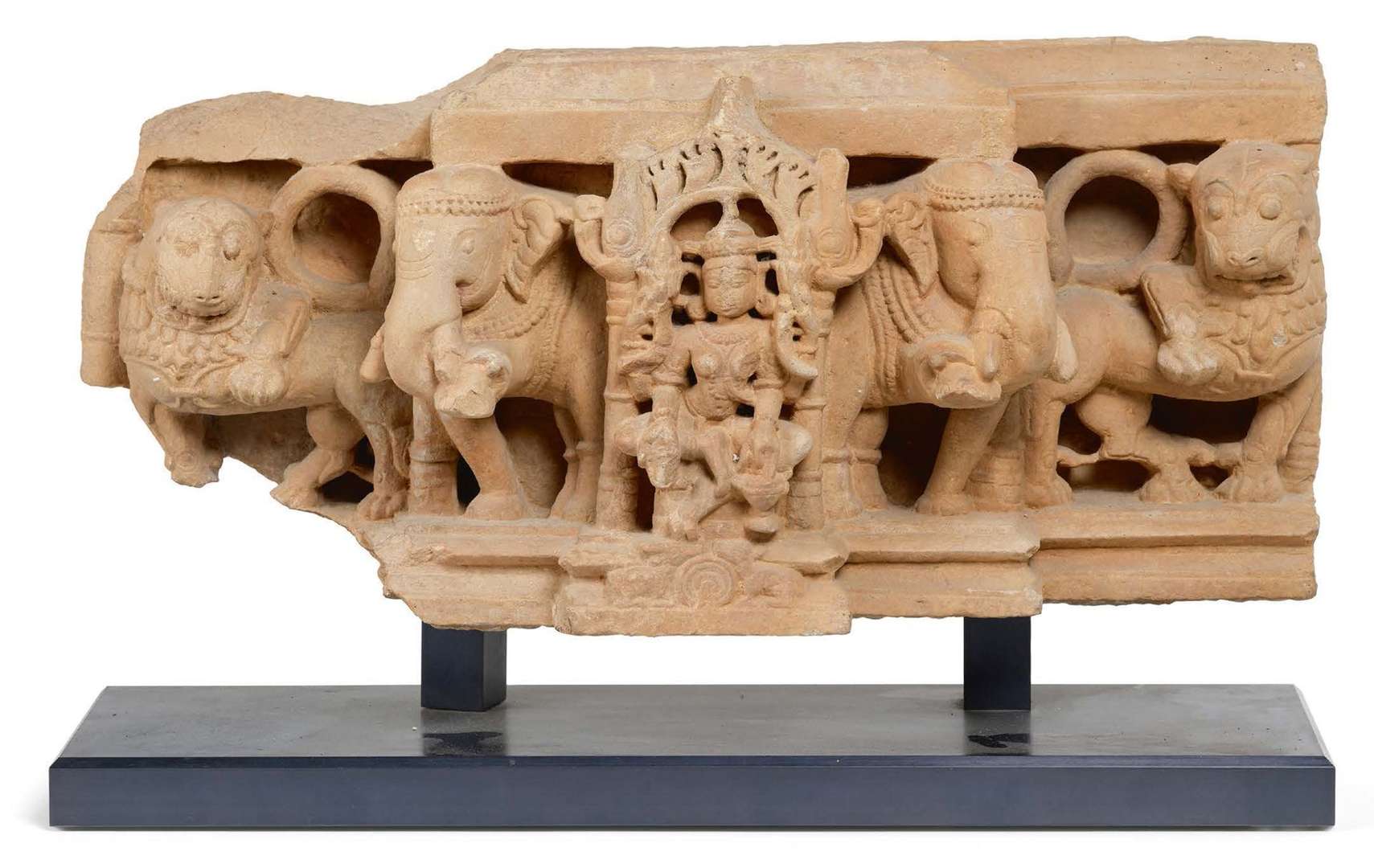 Élément architectural en grès rose représentant la déesse Lakshmi assise en délassement royal sur un trône orné d'une roue encadré de deux daims, en arrière plan un dais architecturé. Elle est flanquée de deux éléphants et deux lions gardiens.