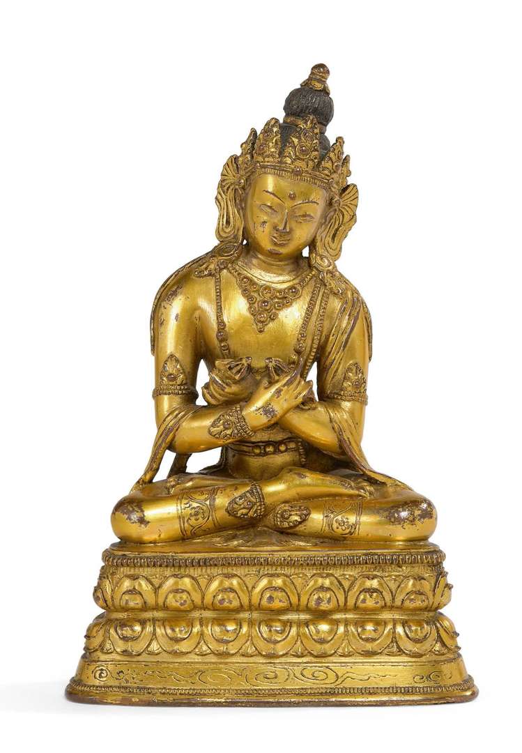 = Statue en bronze doré représentant Vajradhara assis en vajrasana sur une double base lotiforme, les bras entrecroisés devant la poitrine, la main gauche tenant un double vajra, la main droite tenant une cloche gantha.