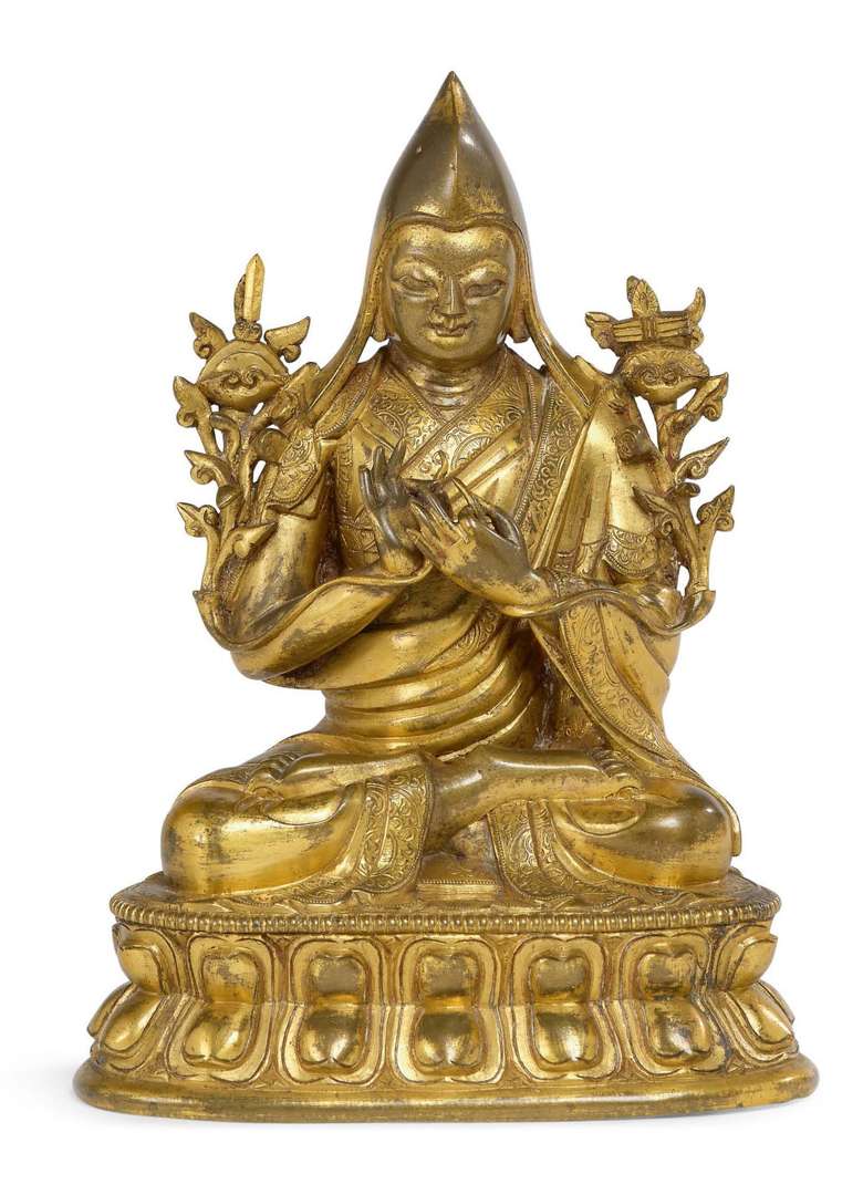 Tsongkhapa, érudit et maître bouddhiste du XIVe siècle, fondateur de l'école des Gelugpa. Le lama est assis en vajrasana sur une double base lotiforme, vêtu d'une robe monastique aux bordures délicatement incisées retombant en plis élégants. Les mains en dharmachakra mudra devant le torse et tenant deux longues tiges florales s'étirant jusqu'aux épaules et supportant ses attributs, l'épée et le livre. Il est coiffé du chapeau traditionnel de l'école Gelugpa. Le visage délicatement incisé, l'expression bienveillante.