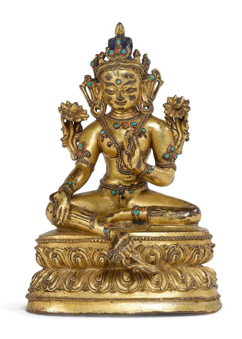 = Statuette en alliage cuivreux doré et incrustations de pierres dures représentant Shyama Tara, assise en lalitasana sur une double base lotiforme, le pied gauche reposant sur une fleur de lotus, la main gauche en varada mudra et la main droite en mudra du refuge, chaque main tenant une tige de lotus s'épanouissant sur les épaules.
