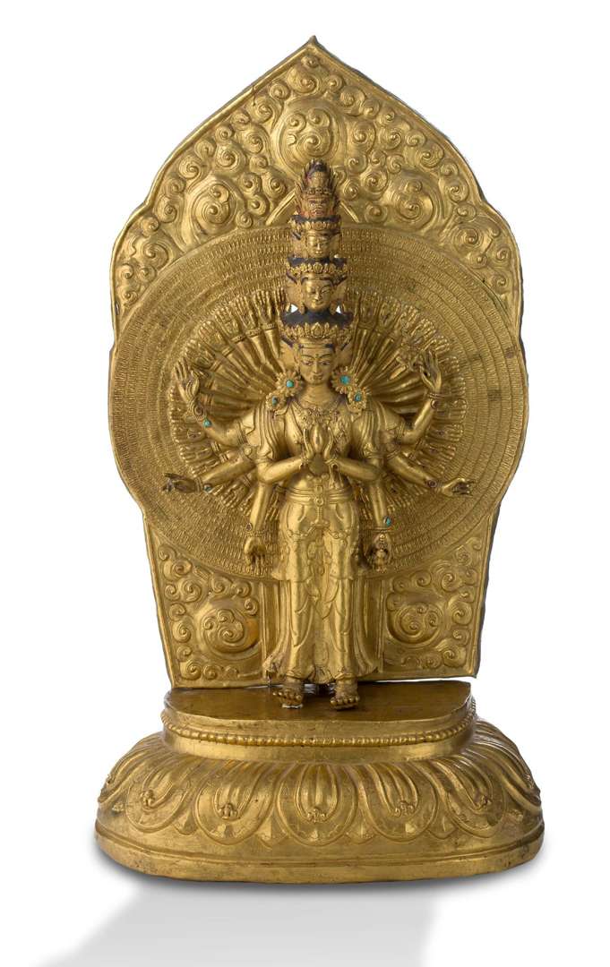 = Importante statue d'Avalokiteshvara à mille bras et onze visages (Sahasrabhuja Lokeshvara) en bronze doré représenté debout sur une haute base lotiforme en alliage cuivreux doré repoussé, la base scellée avec une représentation de double vajra gravée. Le bodhisattva vêtu d'un fin dhoti, paré de nombreux bijoux incrustés de pierres dures, les bras principaux en anjali mudra tenant un joyau au niveau du torse, les six autres bras disposés en éventail autour du torse et tenant ses attributs (rosaire, lotus, aiguière,...). Les neuf premières têtes de la divinité s'étageant les unes sur les autres par groupe de trois tandis que l'avant dernière représente un visage de divinité irrité et la dernière celle du bouddha Amitabha.
