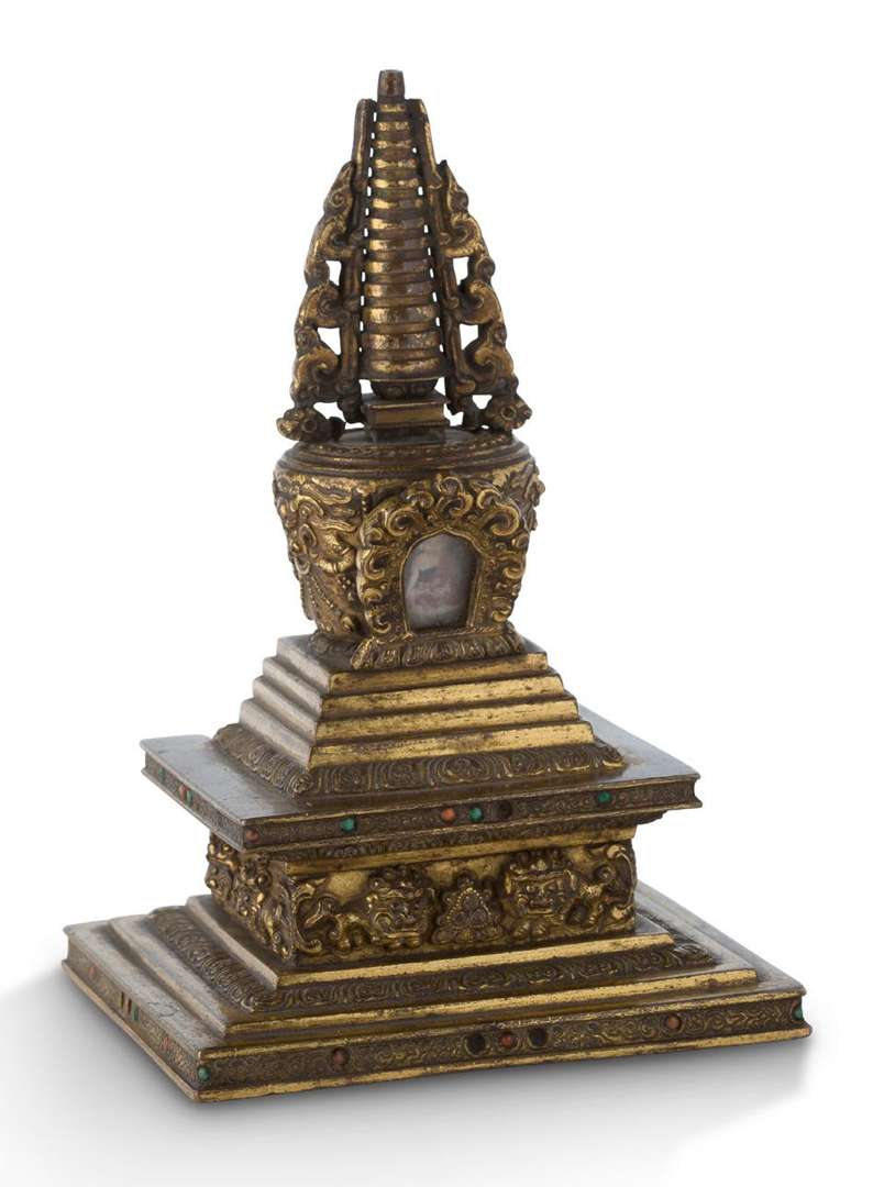 Stupa en bronze doré et incrustations de pierres dures reposant sur une base quadrangulaire étagée, décorée de pétales de lotus ciselés et de figures de lions entourant des joyaux, le corps du stupa orné de masques et de guirlandes de perles avec une représentation peinte d'un bouddha sous verre dans un encadrement en forme de pétale de lotus. L'harmika s'élévant vers le ciel, bordée de flammèches stylisées. La base scellée avec une représentation de double vajra gravée.