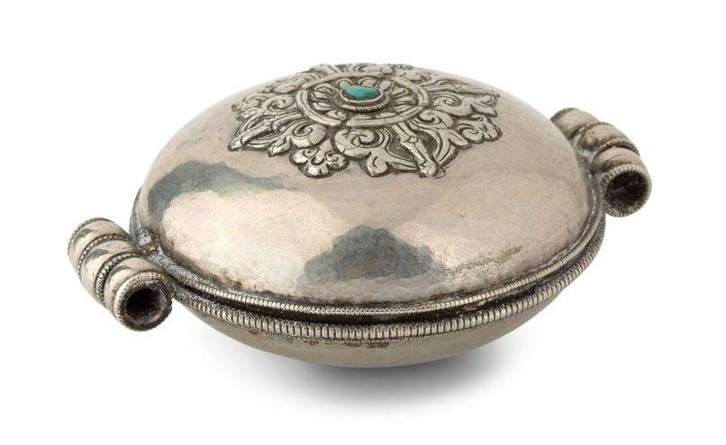 Reliquaire portatif gau en argent repoussé de forme circulaire et bombée, flanqué de trois grandes bélières, la partie supérieure ornée d'un motif de double vajra parmi les rinceaux, avec en son centre une incrustation de turquoise.